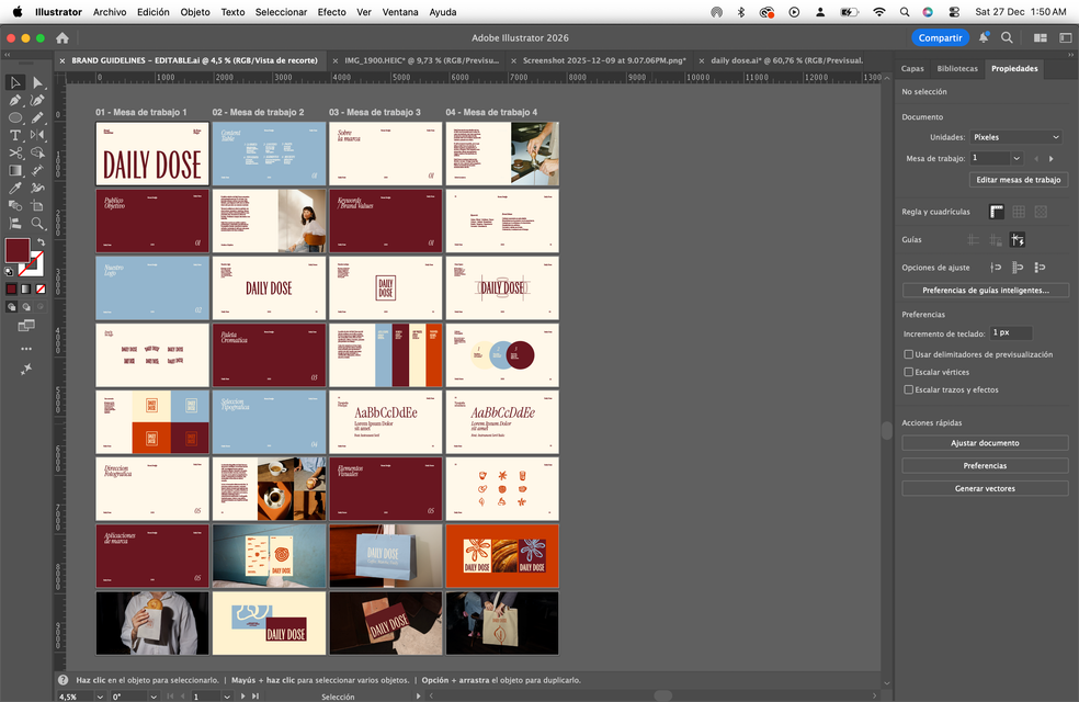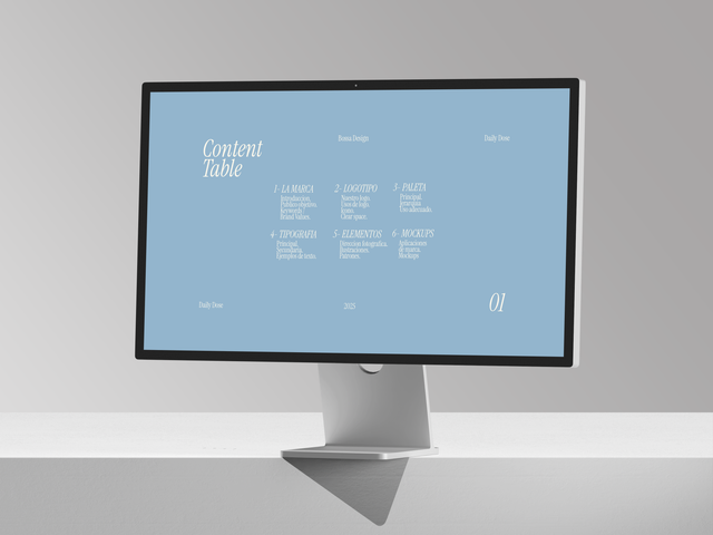 Manual de marca completo, con textos reales. Incluye estrategia, logotipo, paleta cromática, tipografías, dirección visual y aplicaciones reales. Ideal como referencia profesional para construir marcas coherentes.